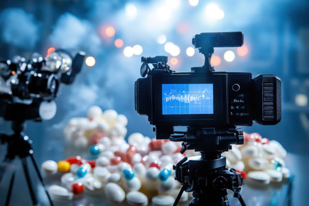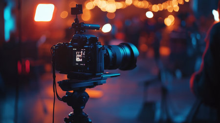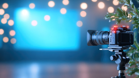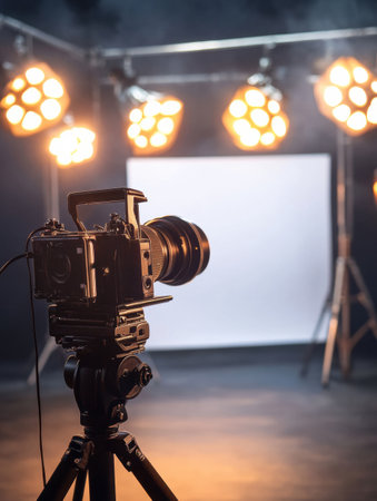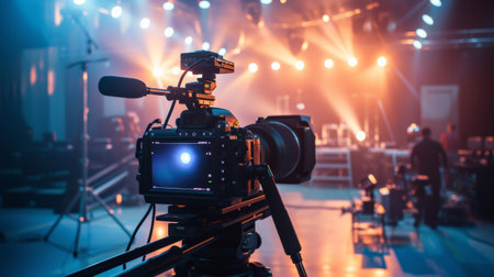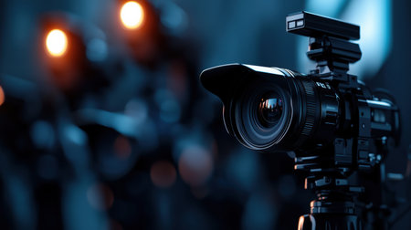 A professional video camera set up in a studio with lights and equipment, creating a dynamic and professional filming environment.