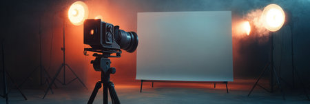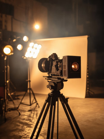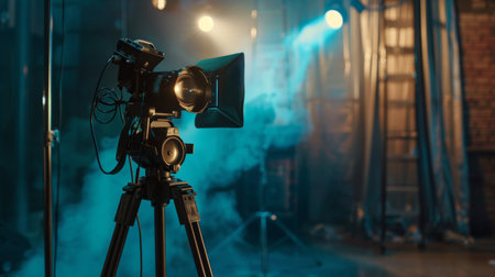 An empty studio scene features a camera on a tripod, illuminated by a spotlight from above. The composition emphasizes a stark contrast with deep shadows. The atmosphere is created with cool tones and diffused light. Suitable for commercial projects that highlight creativity and visual storytelling.