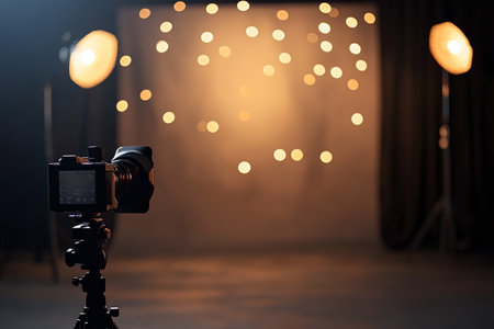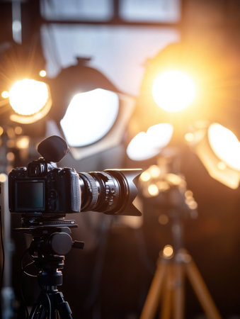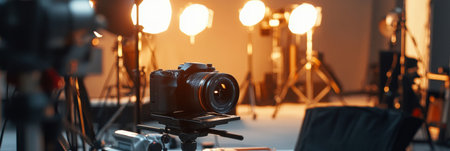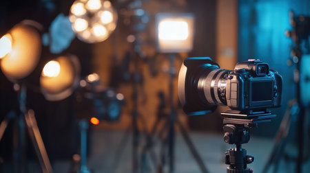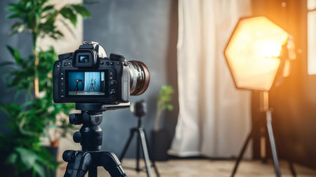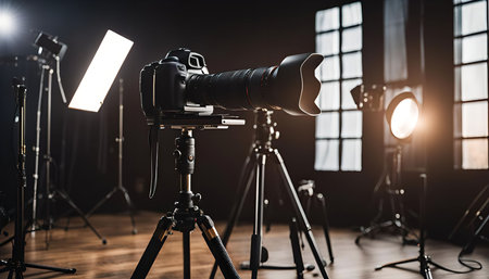 A professional studio setup with a camera, tripod, and lighting equipment, reflecting a creative and modern workspace.