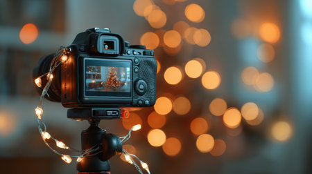 A camera is set on a tripod, capturing the twinkling lights of a Christmas tree, surrounded by a warm and festive atmosphere perfect for the holidays.