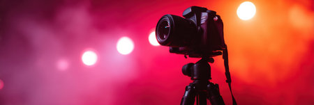 Professional camera against blurred background with bokeh lights. Banner design