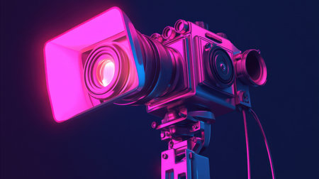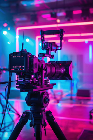 Film camera in neon-lit studio, behind the scenes, cinematic ambience.