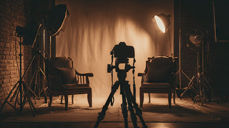 A photography studio scene showcases a camera on a tripod, positioned between two armchairs. The warm lighting illuminates the backdrop and the equipment, creating a professional environment. This setup could be used for various commercial projects, product photography, or editorial content.