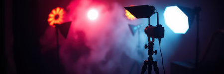 Creative lighting setup with colorful lights and smoke for photography studio