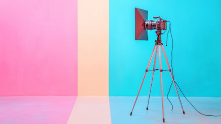 A professional camera set up on a tripod in a vibrant studio with pastel-colored walls, ready for a photo or video shoot in a creative environment.