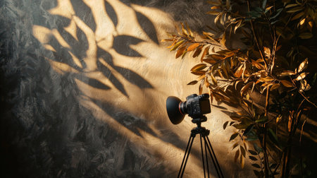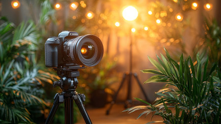 A professional photography camera on a tripod, surrounded by plants and illuminated by warm studio lights, creating a cinematic atmosphere.