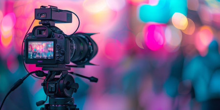 Black camera on a tripod is set up to record an event with colorful blurry background.