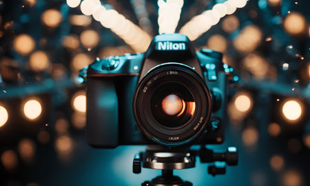 A camera lens is prominently displayed, surrounded by various lighting setups, creating an artistic atmosphere suitable for a photography session.