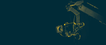 TV Camera broadcast on the crane tripod for shooting or recording and broadcasting content in studio production to on air tv or online internet live show. HD Video recording on crane. Selective focus.