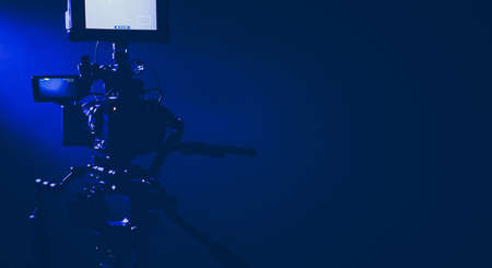 Motion Picture Film Stage Digital Video Camera and Right Side Copy Space. Blue Illuminated Production Studio Interior.