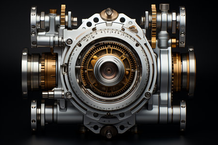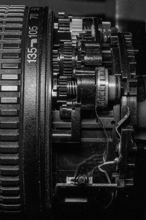 A close up of a camera lens with a lot of gears and metal parts. The lens is made of metal and has a lot of intricate parts. Concept of complexity and sophistication