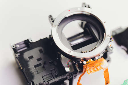 Camera inside, parts of sensor matrix close up. Fixing technology modern device.