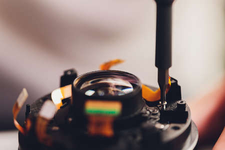 Precision prime optical dslr lens service, adjustment and alignment. Camera lens repair set in photo engineer workplace. Maintenance support of photographic photo camera lens
