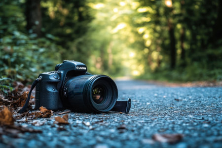 A DSLR camera lays on a paved path through a forest.