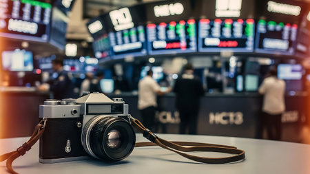 Photo camera in airport terminal with flight information board. Travel and tourism concept