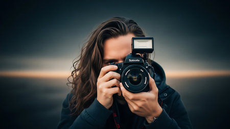 A beginner photographer enjoys the art of capturing a vibrant sunset, holding a camera and focusing on a beautiful landscape. The colors create a stunning backdrop for creativity.