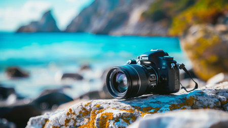 Digital camera placed on a rocky beach with a blurred sea background, emphasizing photography in a scenic outdoor environment.