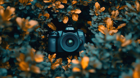 A camera surrounded by vibrant green and yellow leaves in nature, symbolizing photography, creativity, and the art of capturing moments in a natural and colorful environment.