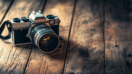 Close-up of a vintage film camera with a black and silver design, placed on a rustic wooden surface. Perfect for photography, nostalgia, and retro themes.
