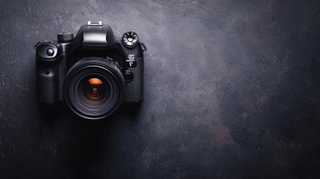 Photographer workplace with dslr camera system on dark black table background. Hobby travel photography concept. Flat lay top view copy space