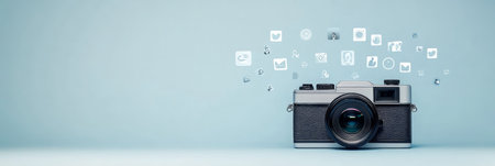 Social media icons floating out of a vintage camera against a blue background representing sharing photos online and social media marketing