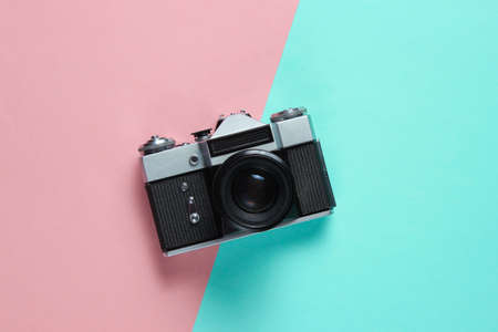 Vintage retro style film camera on pink blue pastel background. Top view