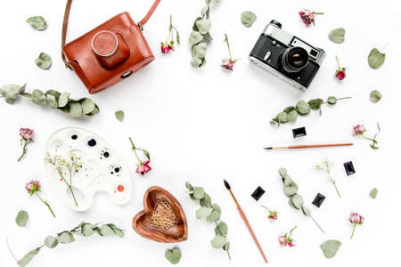 desk, retro camera, watercolor. brushes, leaves eucalyptus on white background. magazines, social media. Home office workspace. flat lay, top view