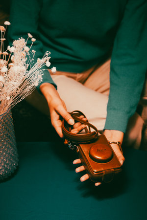 Close-up of a film camera. A young girl in stylish clothes takes photographs with a film camera.