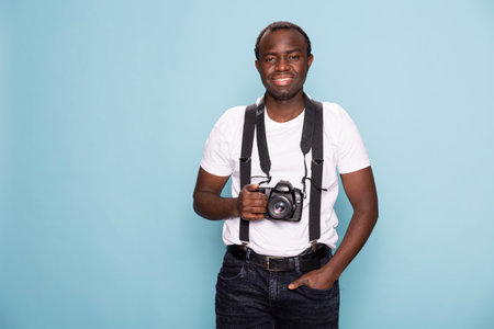 Smiling black photographer in suspenders standing confidently in a studio, posing with a camera around his neck. The clean blue background enhances the sharp, professional look.