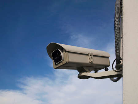 Security cctv surveillance camera in front of blue sky with copy space