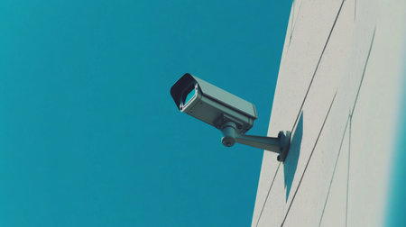 A modern surveillance camera mounted on a building showcases advanced security technology, emphasizing safety and surveillance in urban environments under a bright blue sky.