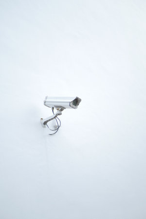 CCTV security camera operating on a white wall with copy space
