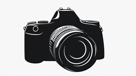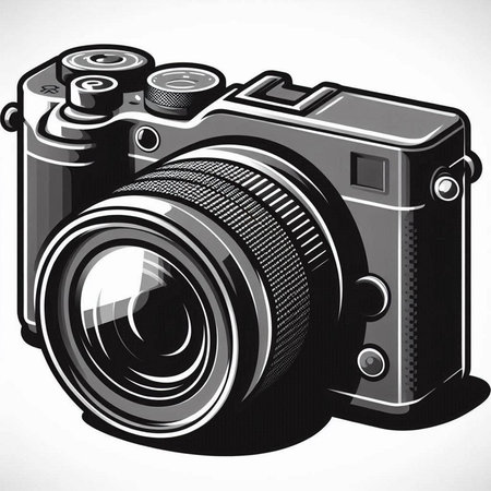 This artwork features a sleek black and white illustration of a modern camera, emphasizing its detailed lens design for artistic and creative projects.