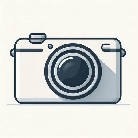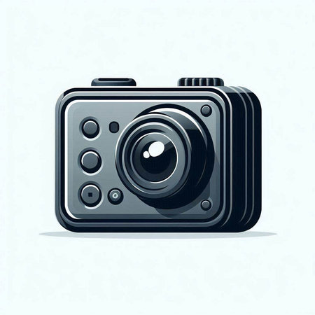 A grayscale illustration presents a vintage camera, emphasizing its design. The camera is rendered in a flat, illustrative style, set against a plain gray background. The composition highlights the shape and form of the photographic equipment, suitable for uses related to photography, design, or visual media.