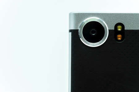 Close up of mobile phone camera lens on a plain white background with copy space