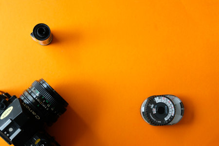 Lublin, Poland, February 01, 2022. classic canon a1 film camera, a roll of black and white film and analog sekonic lightmeter on orange background - top view