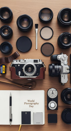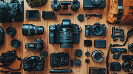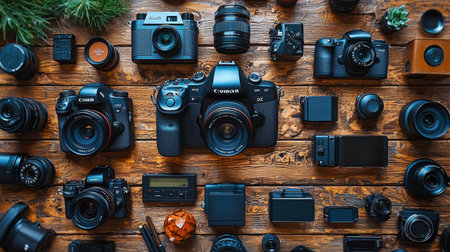 This flat lay composition features an array of photography equipment including cameras, lenses, and accessories on a wooden table, perfect for creative work.