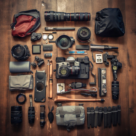 A comprehensive flat lay arrangement of camera equipment and accessories, showcasing various lenses, bodies, and tools ideal for photographers and creators.