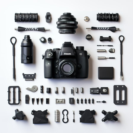 A stylish flat lay arrangement of camera equipment, including lenses, batteries, and accessories. Ideal for photography enthusiasts and professionals.