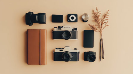 This visually appealing flat lay showcases a combination of vintage cameras, modern devices, a notebook, and decorative dried plants, perfect for creative projects.