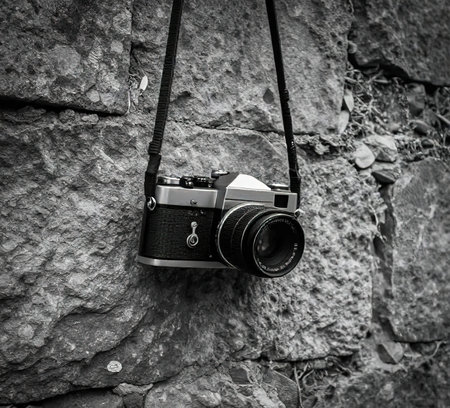 A retro camera is hanging on the old stone wall of the house.Retro film photo camera stands on a cement wall with tropical vegetation on the background outdoors.created with the help of artificial intelligence.