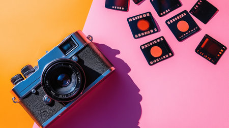 A vintage camera rests on a vibrant pink and orange surface, surrounded by film slides. The perfect image for photography enthusiasts and creatives alike.