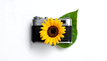 A stunning arrangement showcasing a vintage camera against a vibrant background with scattered photographs, perfect for themes of creativity and nostalgia in photography.