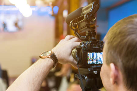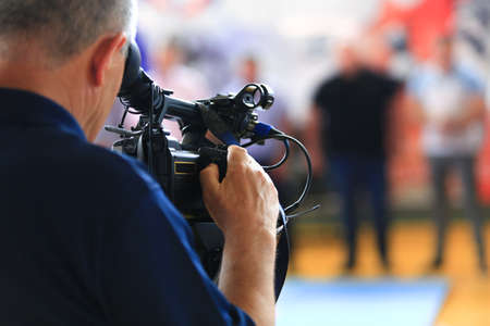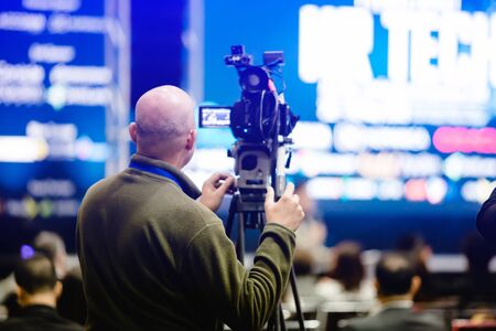 Cameraman recording at media press conference. Live streaming concept.