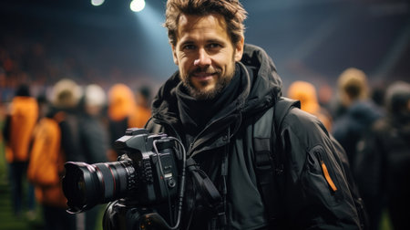 Portrait of a professional photographer on the background of the stadium.