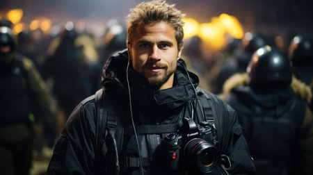 Portrait of a man with a camera in the street at night
