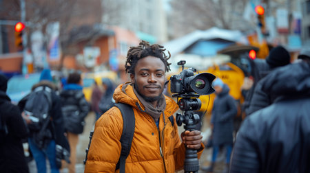 A professional African American videographer in a yellow jacket uses a camera on a gimbal in a bustling urban setting, capturing dynamic footage.