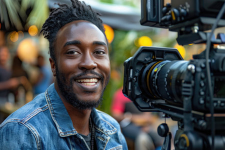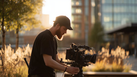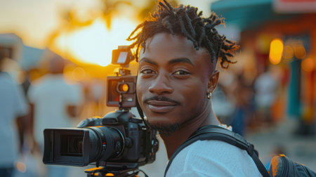 A young African American male videographer with a professional camera, capturing footage outdoors during golden hour.