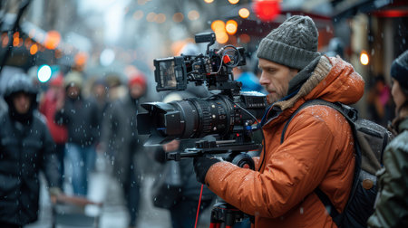Film director working on set with professional camera during snowy weather in urban setting. Focused on capturing scenes with crew in the background.