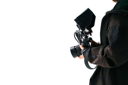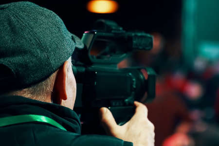 Camera operator. Professional cameraman with HD camcorder in live television. TV reporter at the event. On the air.